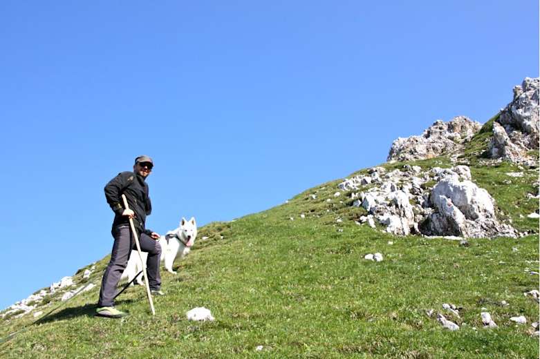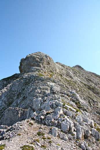 Den Steig auf die Bachofenspitze rechts liegen lassen und weiter in westlicher Richtung dem Steig auf die erste felsige Stufe folgen. Ist die felsige Passage überwunden führt der kleine Pfad immer bergwärts, in wiesen- und felsdurchsetzem Gelände. Dann steuert man auf einen markanten Felskopf zu, der westseitig auf einem Felsband umgangen wird. Durch eine kleine Schotterpassage hinauf auf den breiten Rücken, der einen direkt zum höchsten Punkt auf den Gipfel der Sonntagskarspitze führt.