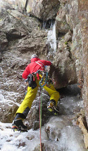 Alle drei Standplätze konnten im Eis gemacht werden. Abseilen an Eissanduhren. Vorsicht: Teilweise einige lose Blöcke im Verschneidungsgrund, nicht anklettern!