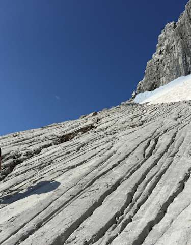 Weiter geht es über eine versicherte steile Wand (Schwierigkeit bis C) hinunter bis zum östlichen Teil des Trippkeeses.