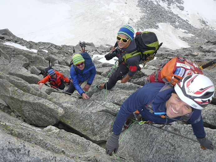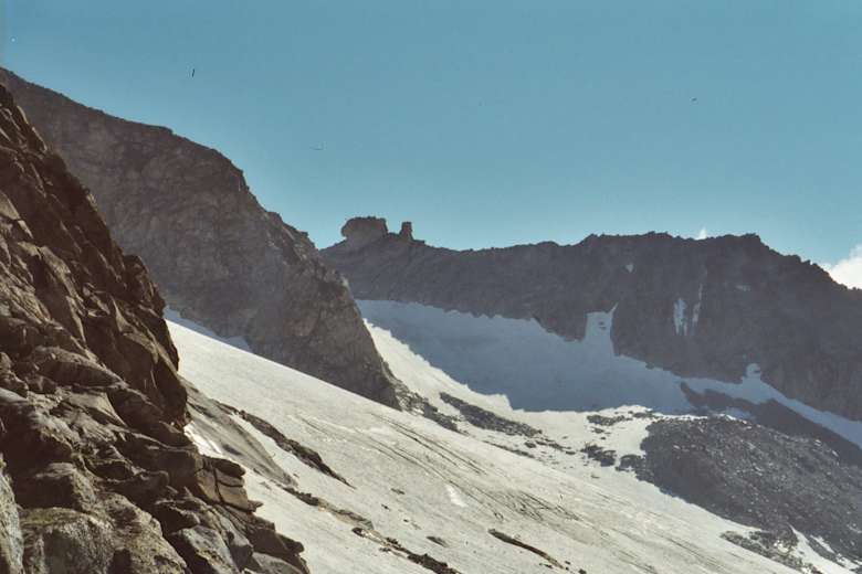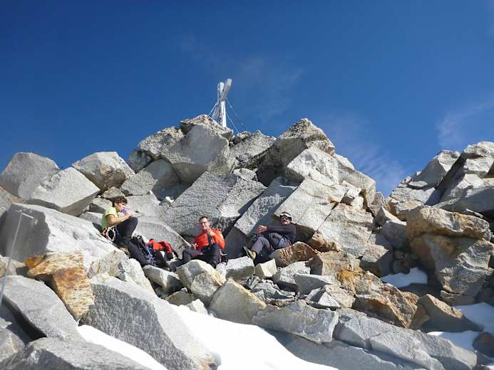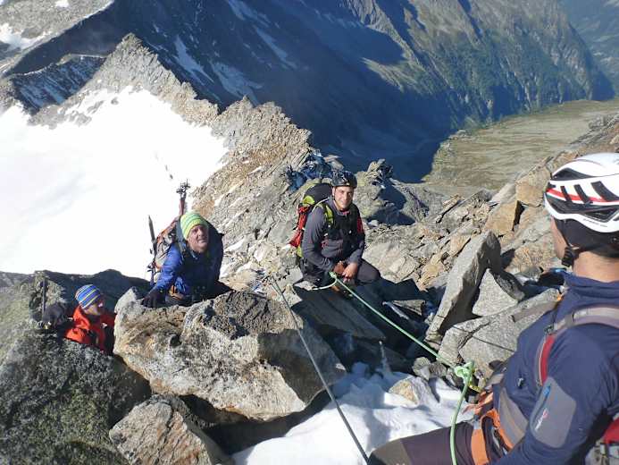 Nun weiter bis zur Winkelscharte (2.860 m). Ab hier über Blockgelände über die Winkelspitz und weiter zur Oberen Winkelscharte. Hier betritt man kurz das Trippkees und geht ein paar Meter aufwärts bis zu den Versicherungen.