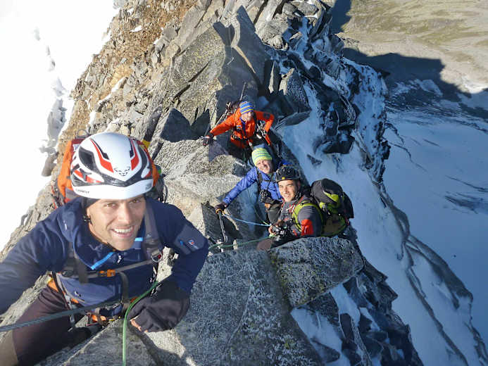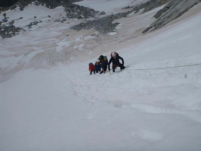 Über ein kurzes ca. 45 Grad steiles Eisfeld kann man bei guter Alpinerfahrung abklettern, ansonsten muss man sich abseilen.
