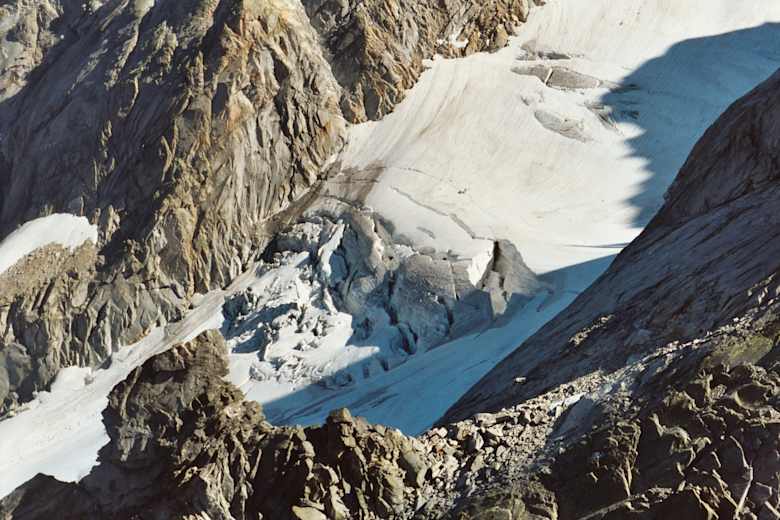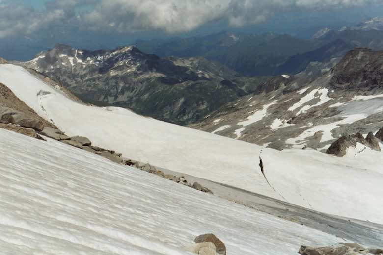 Weiter unten wird das Eisfeld immer weniger steil und man folgt dem Weg bzw. vorhandenen Schneefeldern zurück zur Giessener Hütte.