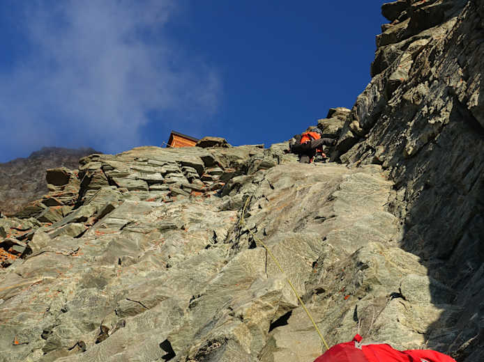 Der Einstieg zu der Tour beginnt gleich hinter der Hörnlihütte (Anstieg zur Hörnlihütte über Hörnliweg). An der Einstiegswand sind Fixseile in Form von dicken Tauen angebracht. Über sie geht es hinauf in das Schuttfeld und weiter zum ersten Couloir.