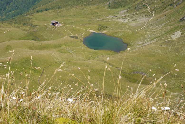 Von hier erblickt man bereits das nächste Etappenziel, die Zupalseehütte. Wieder weiter am Grat, immer geradewegs auf den Gloßglockner zu, bis links der Weg zur gut sichtbaren Zupalseehütte vom Grat abzweigt. Kurz geht's hier recht steil im zick-zack bergab, dann wieder gemütlicher Richtung Hütte und See.