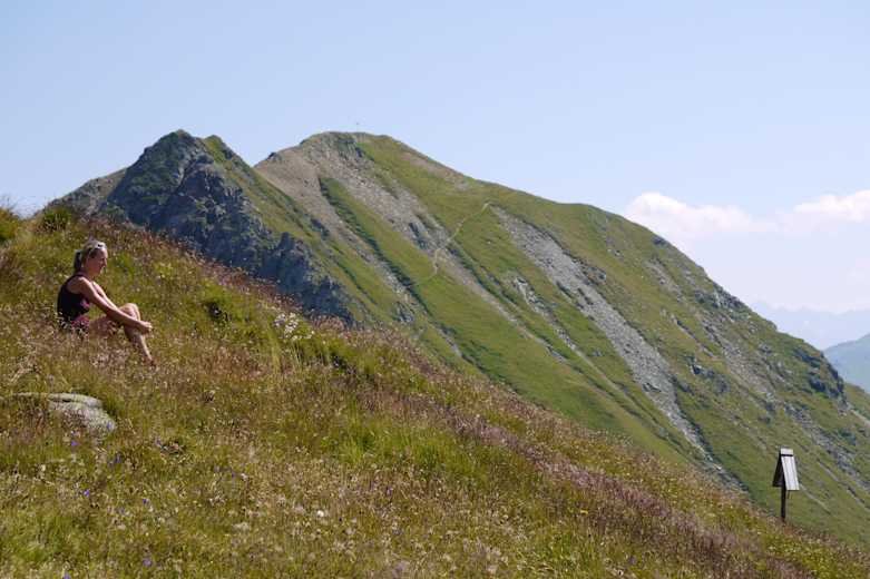 Vom Speikboden (2.660 m) nun in rechts am Grat entlang weiter, anfangs abwärts in die Mulde und anschließend am tiefsten Punkt rechts vom Grat ausweichend (der originale Weg am Grat weiter ist im Moment gesperrt) den Wiesenhang querend, am Ende in einer kleinen Linkskurve auf den Gipfel des Donnersteins (2.725 m).