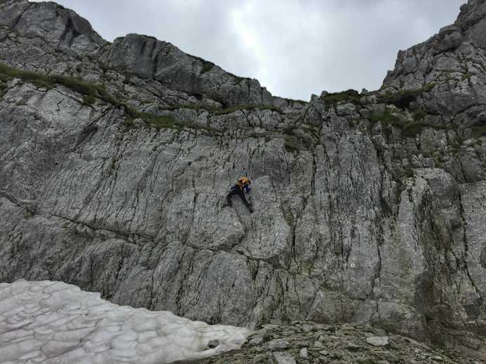 Von der Hütte weg geht es ins Kar des Gletschers weiter, hinter den Blöcken in der Senke des Eisbodens geht es auf einem Steig nach rechts über eine markante, steile Schuttrinne. Hier trifft man auf die plattige Wand, die es nun über gut griffige Platten im II Grad zu erklettern gilt. Oben trifft man auf den sogenannten „Schönen Fleck“, eine Grasscharte am Grat. Über Schrofen und durch Felsblöcke geht es weiter linker Hand am Grat aufwärts.