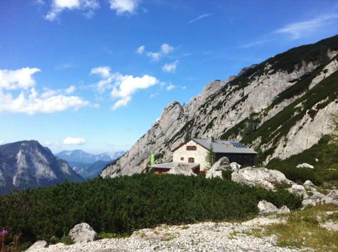 Der Blick auf das Blaueiskar wird frei, der Weg führt an einer Felswand entlang bis man an eine kleine Parkbucht kommt, die zu der Materialseilbahn der Blaueishütte gehört. Vor der Seilbahn zweigt links ein Steig (Schild) von der Straße ab. Dieser führt schmal und steil in kurzen Kehren über einige Holz- und Felsstufen zunächst noch im lichten Wald, dann zwischen Latschen hindurch zur Blaueishütte, die hausgemachten Kuchen bietet (1.650 m).