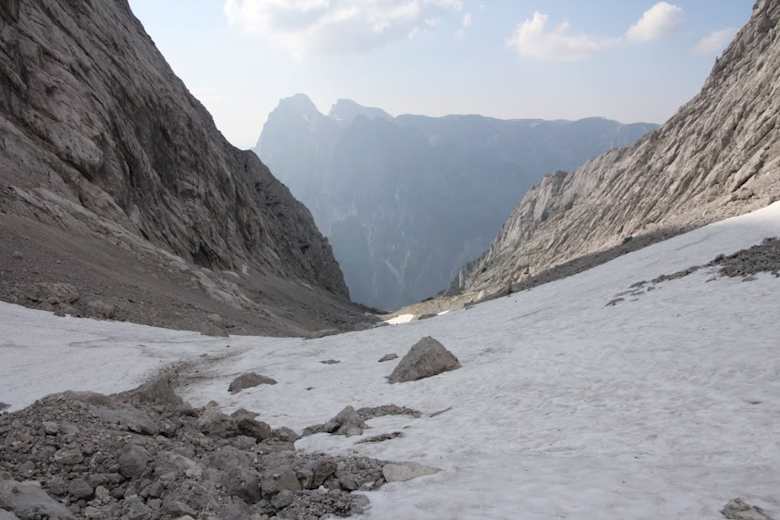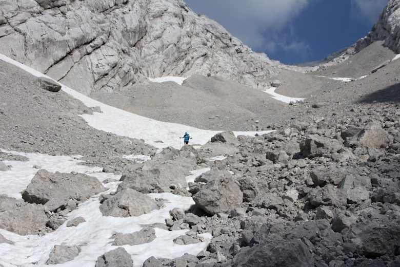 Von hier geht es, den Hinweisschildern folgend, über Felsstufen steil bergab, dann leicht links in die Ofentalscharte, die viel feinen, rutschigen Schotter aufweist und sehr mühsam zu bewältigen ist. Das lange Schuttkar, das später erreicht wird, ist häufig schneegefüllt.
