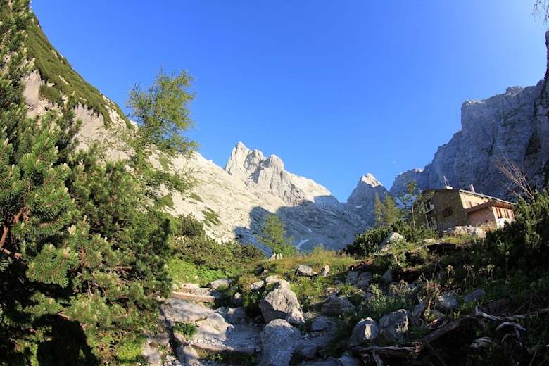 Der imposante Ausblick von hier auf die kargen Gipfel und den Blaueisgletscher raubt einem erst einmal den noch verbliebenen Atem. Die Blaueishütte markiert den Fuß eines imposanten Gletscherkars, an dessen Ende der Blaueisgletscher, der nördlichste Gletscher der Alpen, zu bewundern ist. Eingerahmt von den Gipfeln der Blaueisspitze, des Hochkalter und des Kleinkalter kann der Gletscher seinem Namen allerdings nicht mehr allzu viel Ehre machen, denn er ist erheblich geschrumpft.