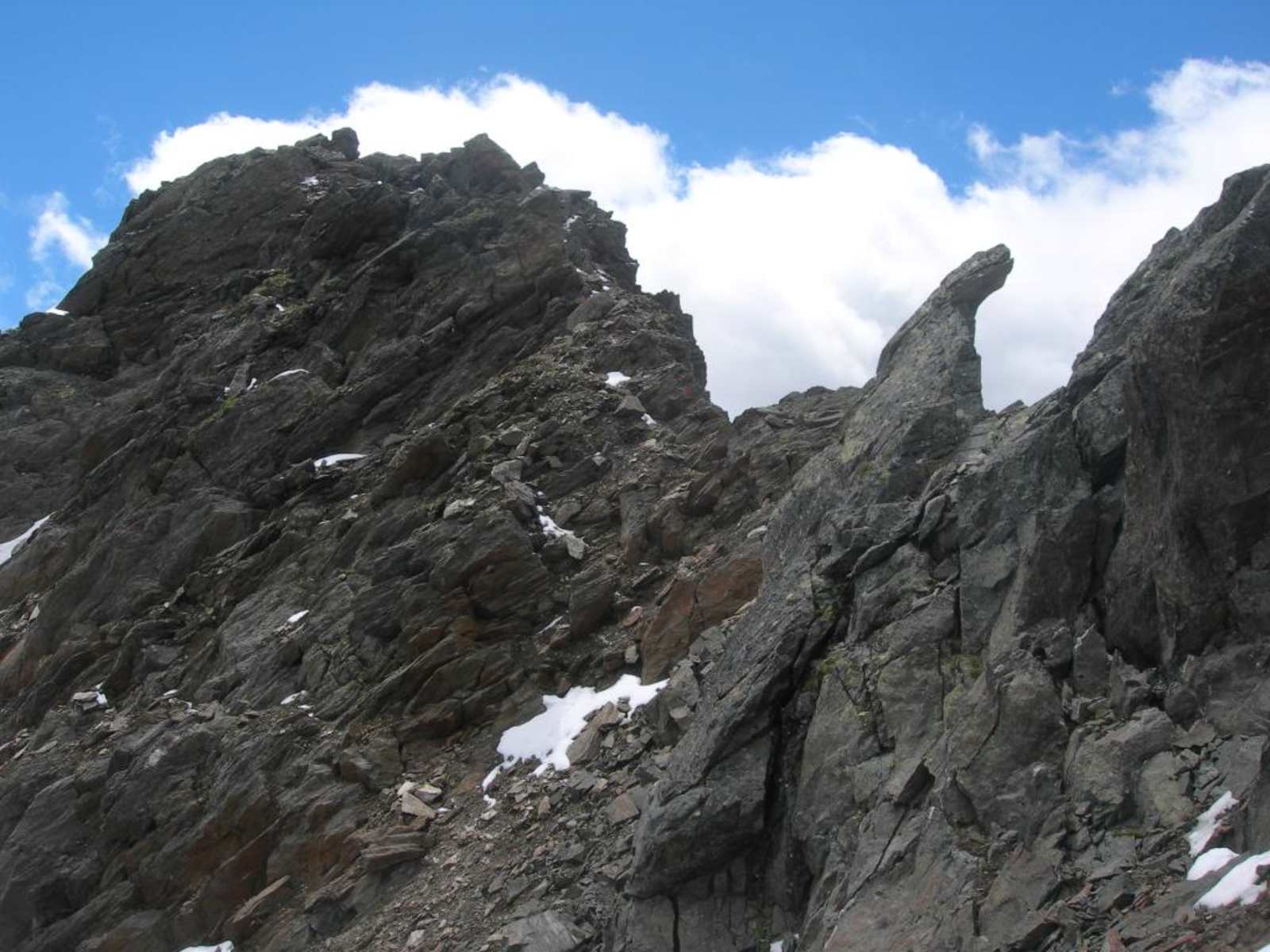 Immer auf dem Grat, teilweise einfach, dann jedoch wieder in recht ausgesetzter Kletterei. Die Punktmarkierung ist durchwegs gut sichtbar. Kurz vor dem Zwieselbacher Roßkogel muss man über eine ca. 30 m hohe Platte mit 40 ° Neigung klettern. Schließlich hat man es aber geschafft und steht am Gipfel des Zwieselbacher Roßkogels mit seinen 3.081 m.