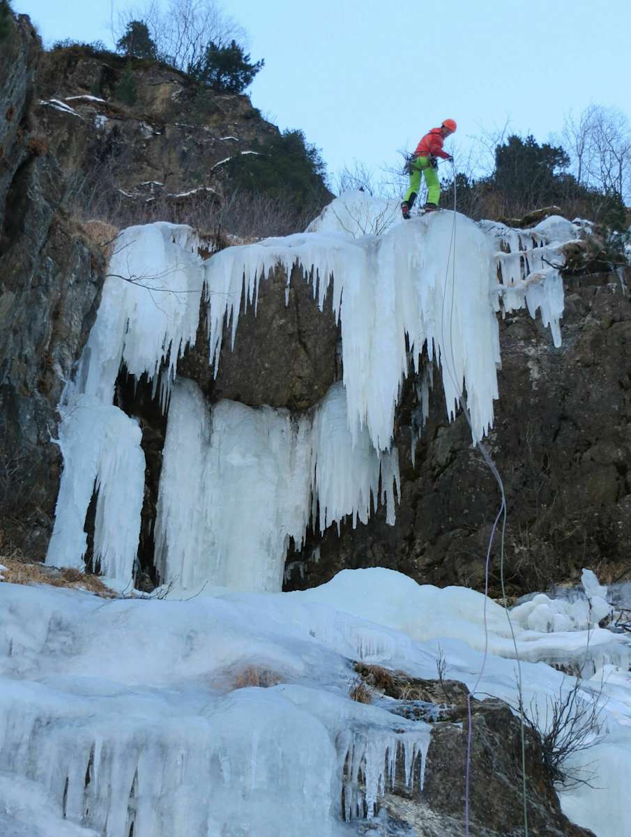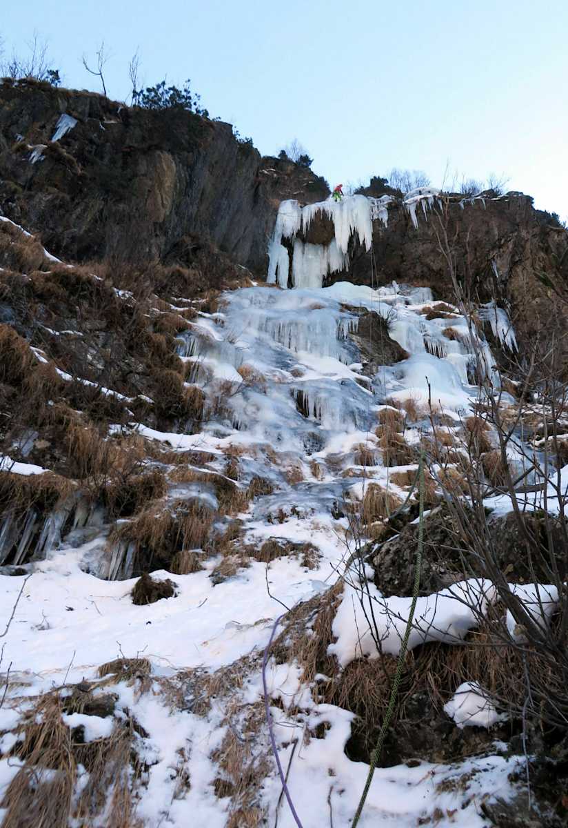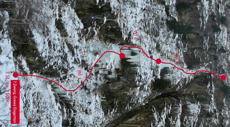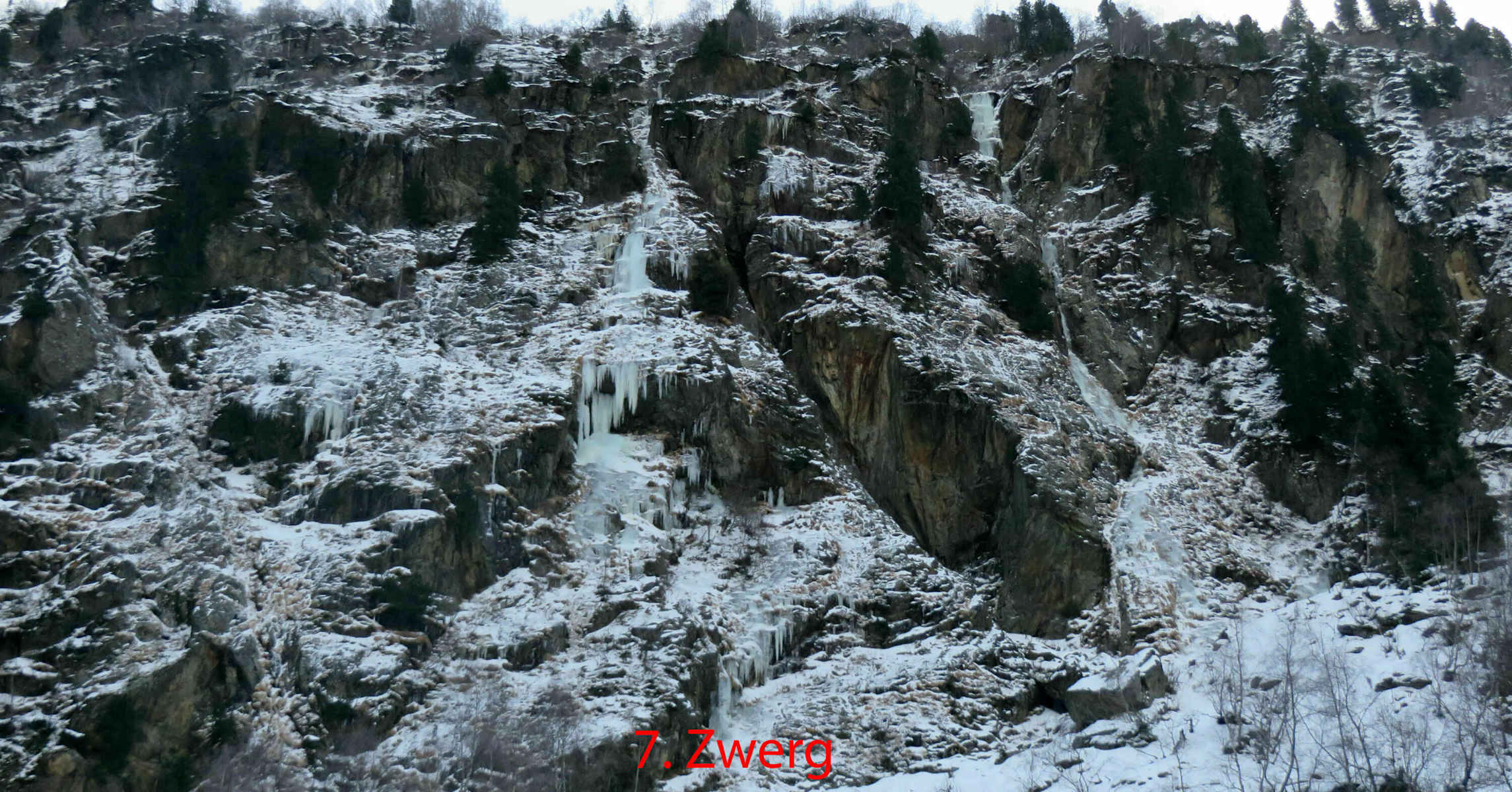 Die erste Seillänge bietet nette Eiskletterei an einer gut gestuften Einstiegsrampe bis zum Beginn einer Säule, hier Stand. Die zweite Seillänge startet mit einer ca. 10 m hohen, senkrechten Säule, die am besten über links geklettert wird (siehe Foto Topo 7.Zwerg). Nach der Säule folgt gestuftes Gelände bis zum nächsten Aufschwung. Hier Stand. Die dritte Seillänge bietet eine ca. 10 m hohe Steilstufe und leichtere Kletterei über eine meist schmale Eisspur. Stand am Ende dieser Eisspur.