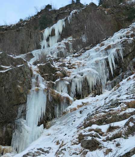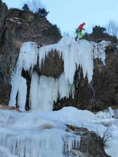 3 Seillängen, ca. 150 m Gesamthöhe, Schwierigkeitsgrad WI 3 und WI 4.