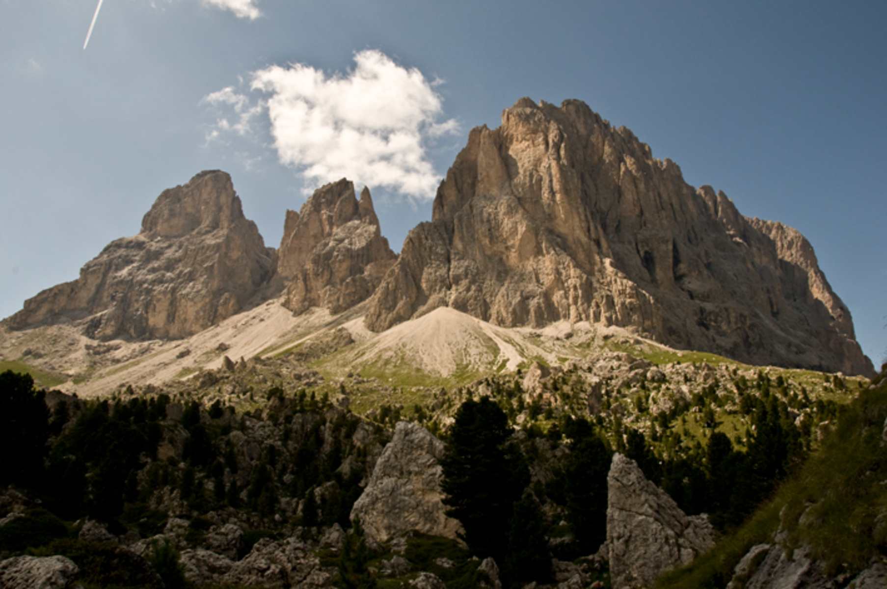 Von Wolkenstein aus fährt man hinauf zum Sellajoch. Kurz oberhalb der Sessellift-Bergstation geht man über einen erdigen Grat zu den südöstlichen felsigen Ausläufern der Grohmannspitze. Man folgt dem Felsensporn bis zu einem Schutthang, an dessen linkem Ende sich der Einstieg befindet.