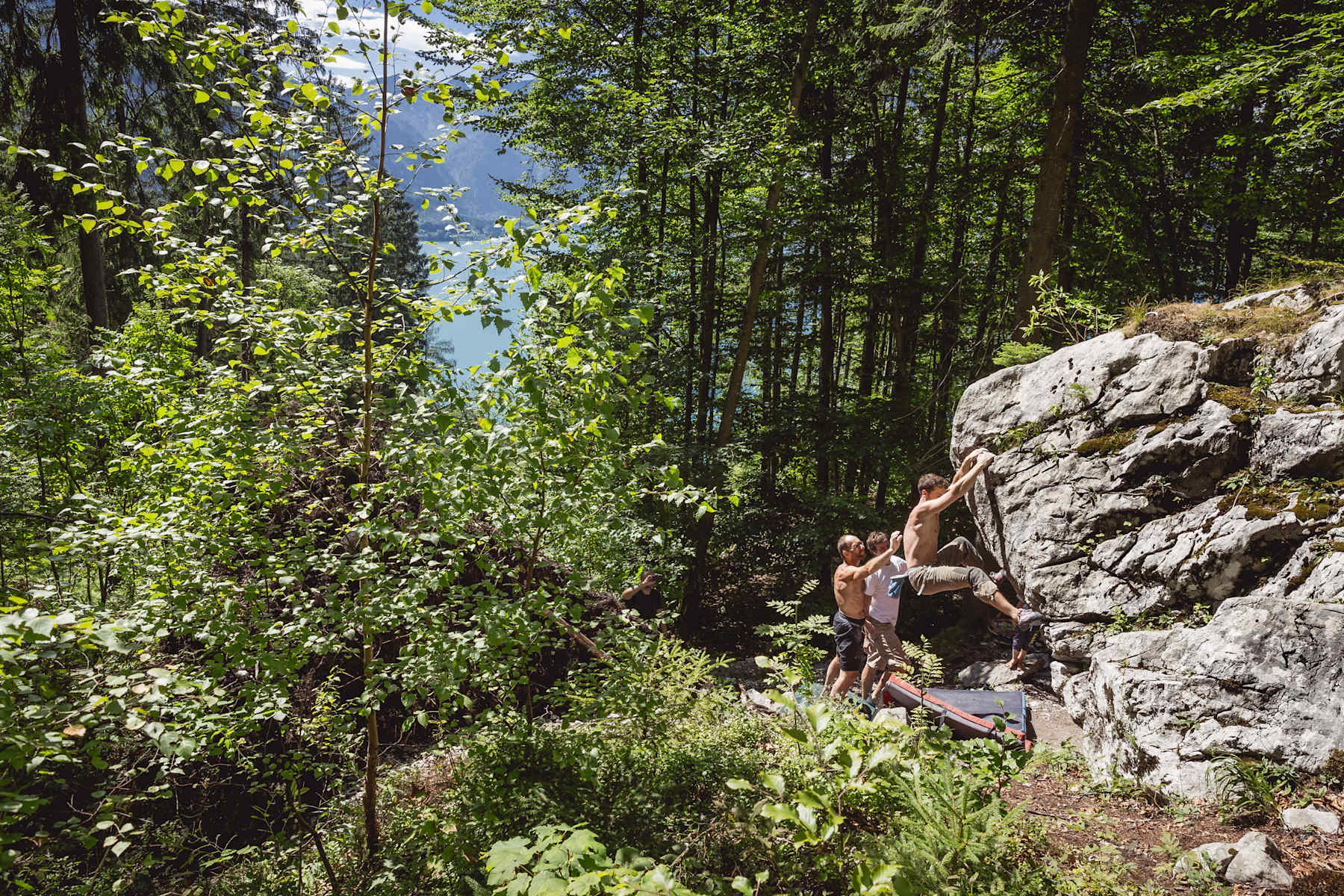Block Kobolus am Attersee: Am Boulderhotspot Attersee in Oberösterreich gibt es insgesamt 140 Boulderblöcke mit 300 Boulderproblemen. Das Bouldergebiet Forstamt liegt am oberösterreichischen Attersee auf halbem Weg zwischen Weißenbach und Steinbach und ist vom Ufer zu Fuß in rund 10 Minuten zu erreichen. Bergseitig führt die Forststraße zum Brennerriesensteig (Weg Nr. 821), in dessen unterem Abschnitt viele Boulder liegen.