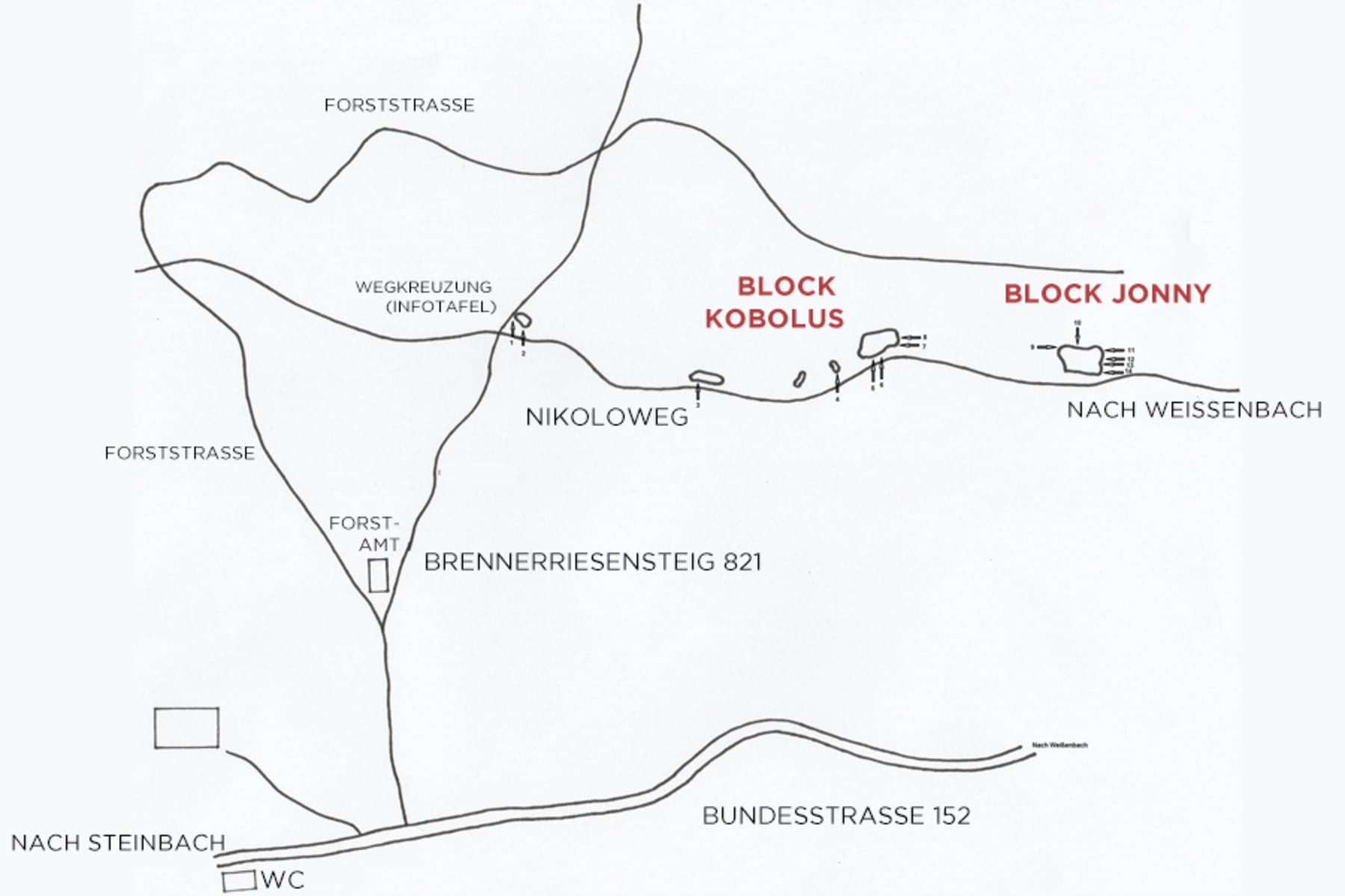 Vom Parkplatz an der B152 auf halbem Weg zwischen Weißenbach und Steinbach ('Forstamt' geht man die Forststraße zum Brennerriesensteig (Weg Nr. 821) entlang, in dessen unterem Abschnitt viele Boulder liegen. Bei der Wegkreuzung mit Infotafel zweigt man nach rechts auf den Nikoloweg ab und erreicht nach insgesamt ca. 10 Minuten den Boulderblock Kobolus.