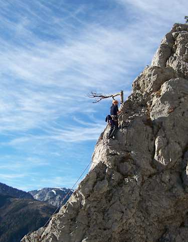 Ganz oben wurden nach links durch Klaus Hoi zwei sehr schöne und lohnende Ausstiegsseillängen („Linker Ausstieg“, 4+) eingerichtet.