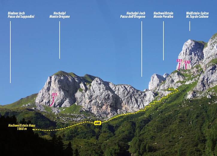 Zuerst über den Forstweg, später über den markierten Steig ca. 50 Minuten bis zur Hochweisssteinhütte (1.876 m). Von der Hütte aus ist die Kletterroute in 30 Minuten erreichbar.