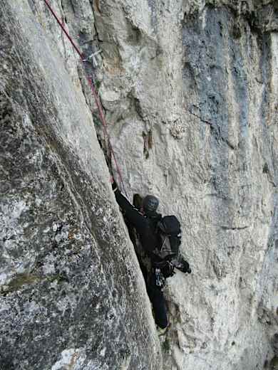 Die Linie besticht durch ihre eindrucksvollen und ausgesetzten Passagen im 6. Schwierigkeitsgrad in durchwegs guter Felsqualität. Zudem ist die Absicherung mit Bohrhaken gut bis sehr gut, wobei ein paar Cams für die Risse nicht schaden können.