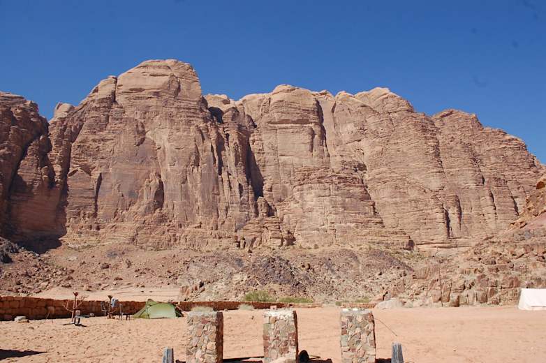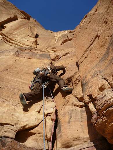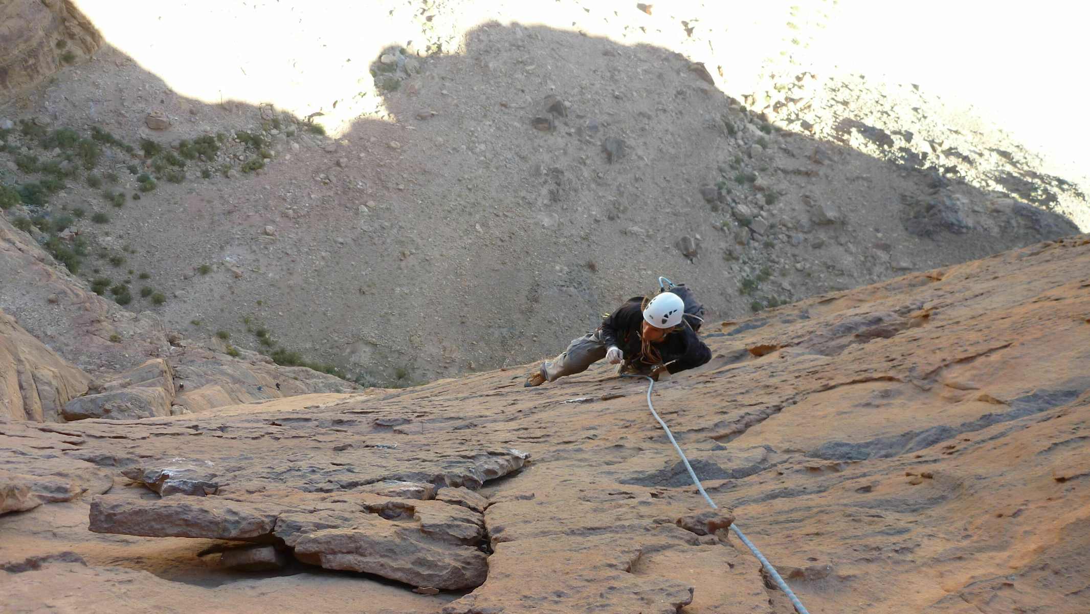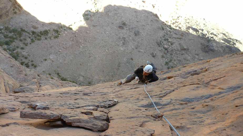 The Inshallah Factor (6c, 15 SL) im Jordanischen Wadi Rum ist eine der imposantesten und schönsten Kletterrouten der Region. Obwohl die Route aufgrund mangelnder Absicherungsmöglichkeiten nicht sehr oft begangen wird, lohnt es sich diese Königslinie durch die Ostwand des Jebel Rum (1.754 m) in Angriff zu nehmen.