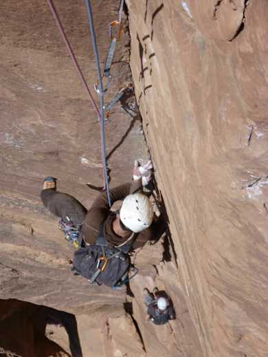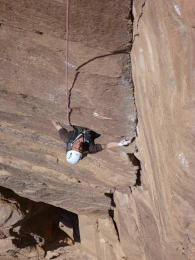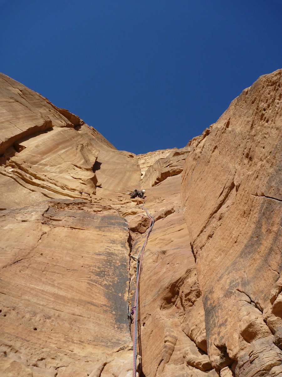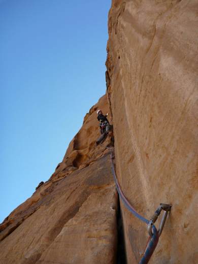 Die ersten vier Seillängen der Tour (6b, 5a, 6a+, 6a) sind recht gut mit Friends und Keilen abzusichern und die Routenfindung ist aufgrund des klaren Rissverlaufes recht einfach.