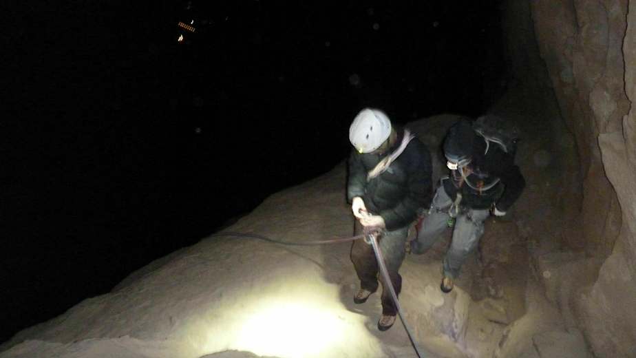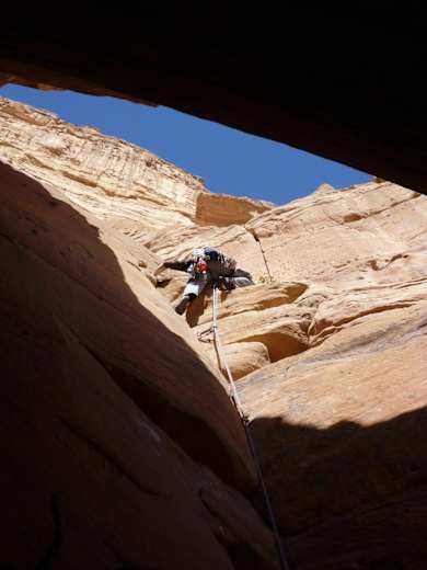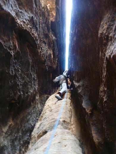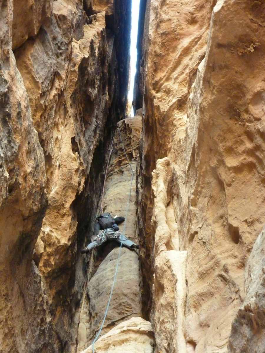 Die letzten Beiden Seillängen (5a, 5b) führen durch den sogenannten „Fire-Exit-Chimney" in Kaminkletterei vom feinsten nach oben direkt in das „Eye of Allah", einer Höhle am Gipfel der Tour.Abstieg