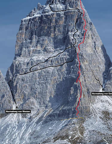 Die fünfte Seillänge (6c) gilt als Crux und ist abgesehen von recht anspruchsvoller Risskletterei an winzigen Fingerrissen auch sehr schwer abzusichern. Wem diese Seillänge zu anspruchsvoll ist der kann diese technisch (A1) lösen.