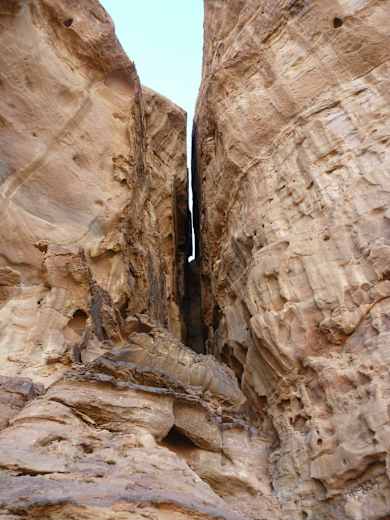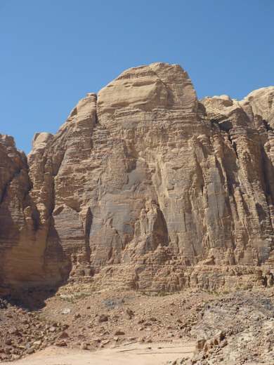 Der Abstieg vom Gipfel ist lang und mühevoll. Man seilt erst vom „Eye of Allah“ ab und gelangt dann in das Innere des Jebel Rum. Dort ist leider die Wegfindung sehr kompliziert und man hat oft nur von Kletterern erbaute Steinmänner als Anhaltspunkte. Schließlich gelangt man zur „Hamad`s Route“, einer Beduinenroute auf den Jebel Rum. Dieser folgt man bis man wieder Boden unter den Füßen hat.