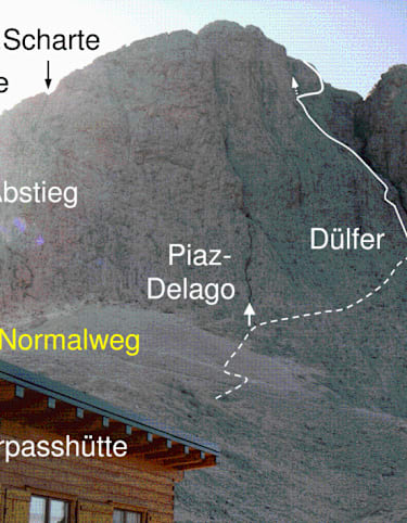 Zustieg: Von der Auronzohütte folgt man dem breiten Weg, der zur Paternscharte führt, bis zur Kapelle. Hier erkennt man schwach Steigspuren und folgt diesen bis zum Schutthang und zur Schlucht zwischen Kleiner und Großer Zinne. In der Schlucht steigt man noch 30m höher, bis man eine Rampe an der nördlichen Schluchtwand erkennt.