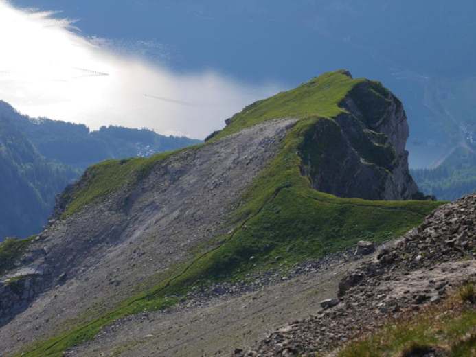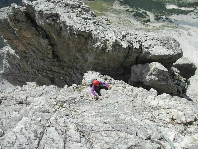 In leichter Kletterei steigt man in eine breite Rinne (II°), die sich in eine steile Schlucht verengt, zur 2. Scharte hinauf. Jetzt überquert man eine Schuttschlucht und steigt links zur 3.Scharte auf. Einige Schritte weiter rechts klettert man über eine griffige steile Wand (III°) zu einem schmalen Band (hier befindet sich ein Abseilring).
