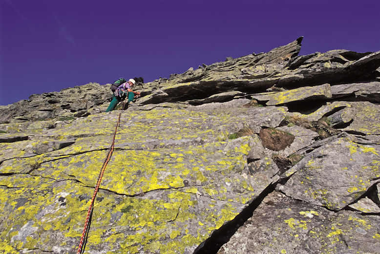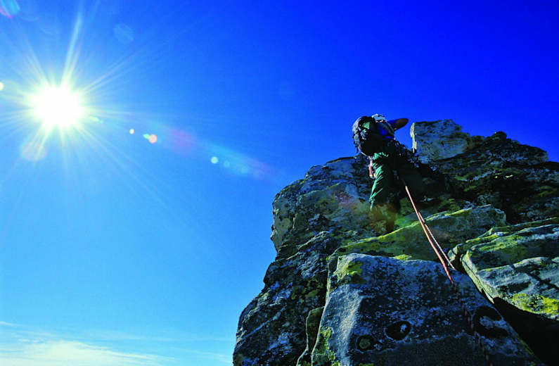 An der Kante klettert man der Sonne entgegen - am NNE-Grat des Pizzo Solögna Foto: topoverlag - Marco Volken