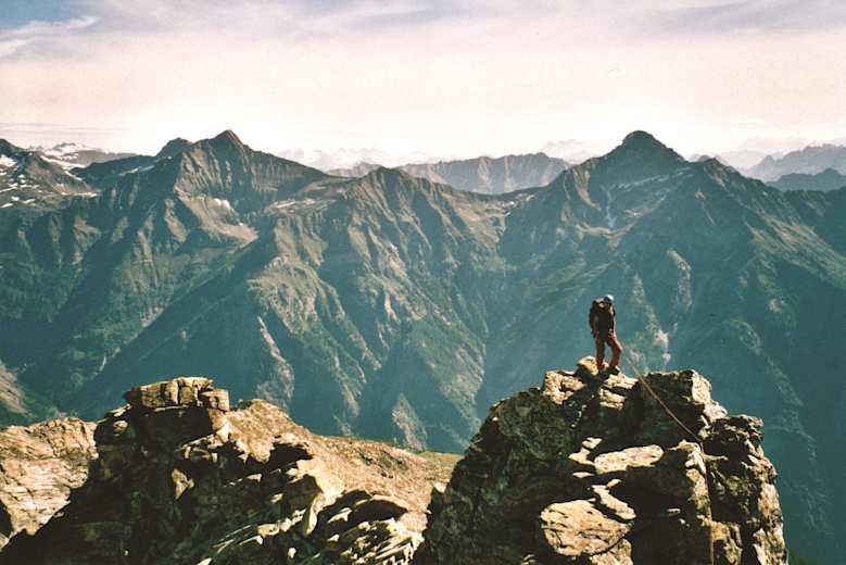 Anders am Westgrat: Wegen der Exposition klettert man am Morgen noch im Schatten. Tau feuchtet Griffe und Tritte. Es bräuchte wenig mehr und man würde umkehren. Das wäre aber schade, denn je höher man kommt, desto besser wird der Fels. Besonders eine Stelle bleibt in Erinnerung: An einer Gratstufe erleichtert eine 1,5 m weit ins Leere hinausragende Platte als hochwillkommener Tritt den Weiterweg. Sehr behutsam belastet man sie. So ist der Grat doch noch zu packen.