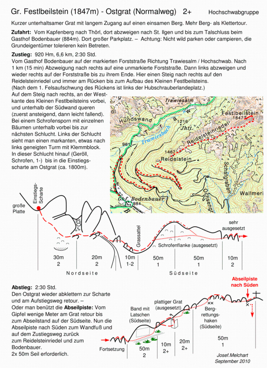 Der Festlbeilstein ist einer der wenigen Gipfel des Hochschwabmassivs, die nur durch Kletterei zu erreichen sind. Der leichteste Weg auf ihn führt über den Ostgrat, der auch in der hier beschriebenen Tour beschritten wird. Vom Gasthof Bodenbauer in St. Ilgen bei Thörl geht es zunächst auf den Reidelstein, bevor der 1.847 m hohe Gipfel erreicht wird. Für den Abstieg stehen mehrere Optionen zur Verfügung.
