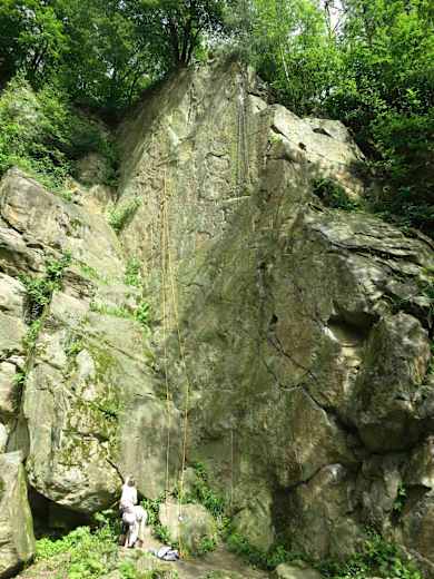 Vom Parklatz folgt man der Forststraße für rund 5 min, überquert eine kleine Brücke und gelang so in den Steinbruch. Der Klettergarten bietet 21 Routen in den Schwierigkeitsgraden 3 bis 9- und er ist durchaus familienfreundlich. Allerdings sollte man unter der Wand immer einen Helm tragen, da sich gelegentlich Steine lösen. Aufgrund der Ausrichtung nach Nordosten ist der Klettergarten gerade an warmen Sommertagen sehr beliebt.
