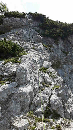 Nach den ersten drei Seillängen hat man die Wahl: entweder man nimmt die direkte Variante, die über schöne, feste Platten führt, oder aber die ganz leichte Alternative, die aber etwas erdig ist. Insgesamt sind 9 Seillängen zu bewältigen, bevor man oben nach rechts zum Ausstieg gelangt. (Details siehe Topo.)