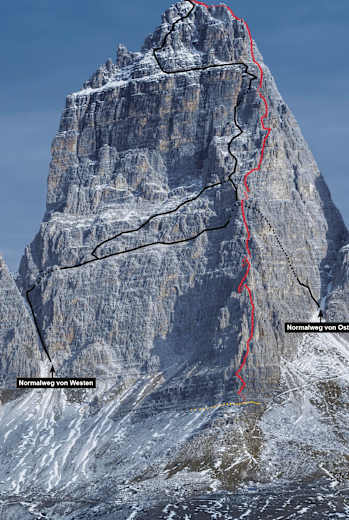 Die Erstbegehung dieses „neuen Normalweges" auf die Große Zinne erfolgte durch Christoph Hainz und Gerda Schwienbacher im Oktober und November 2018 sowie Juni 2019
