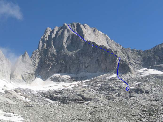 Direkt hinter dem Punkt 2590 steigt man auf Bändern nach Osten (links) ab. Über eine heikle Stelle kann man eventuell einmal abseilen. Hier ist gut zu erkennen, dass der originale Zustieg der Erstbegeher über den Heute stark zerklüfteten Gletscher heute nicht mehr empfehlenswert ist. Altschnee, Firn und Seracs können auf der folgenden Querung Problem genug sein. Wieder leicht bergauf befindet sich der Einstieg nach mehreren markanten Schuppen.