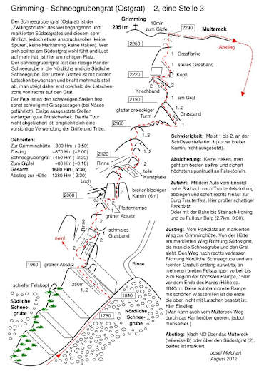 Der Grimming liegt etwas abseits des eigentlichen Dachsteinmassivs und wurde aufgrund seiner imposanten Erscheinung lange für den höchsten Berg der Steiermark gehalten. Meist wird er über den Südostgrat bestiegen, die hier beschriebene Route über den Schneegrubengrat ist eine etwas anspruchsvollere Alternative zu diesem. Der Schneegrubengrat ist nicht markiert und bietet keine Haken, deswegen sollten sich nur Alpinisten daran wagen, die seilfreies Klettern gewohnt sind.