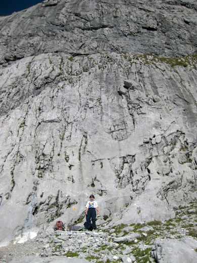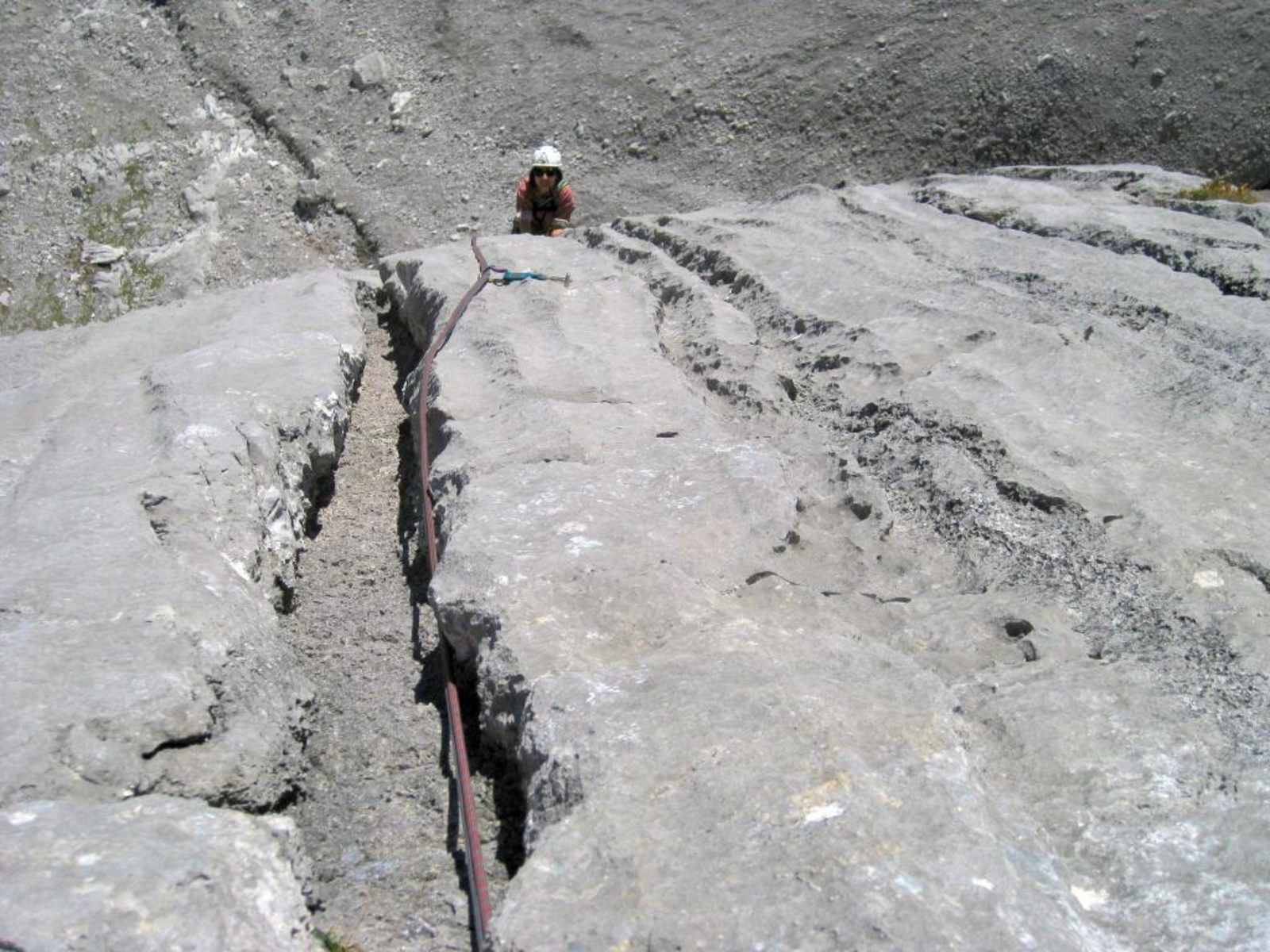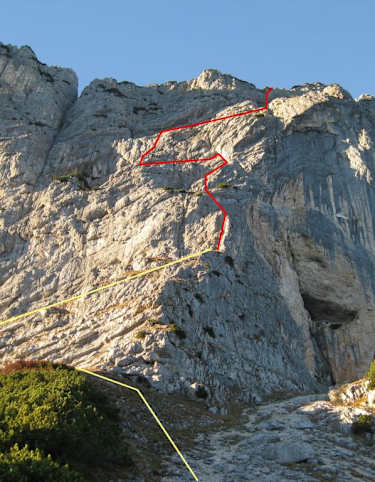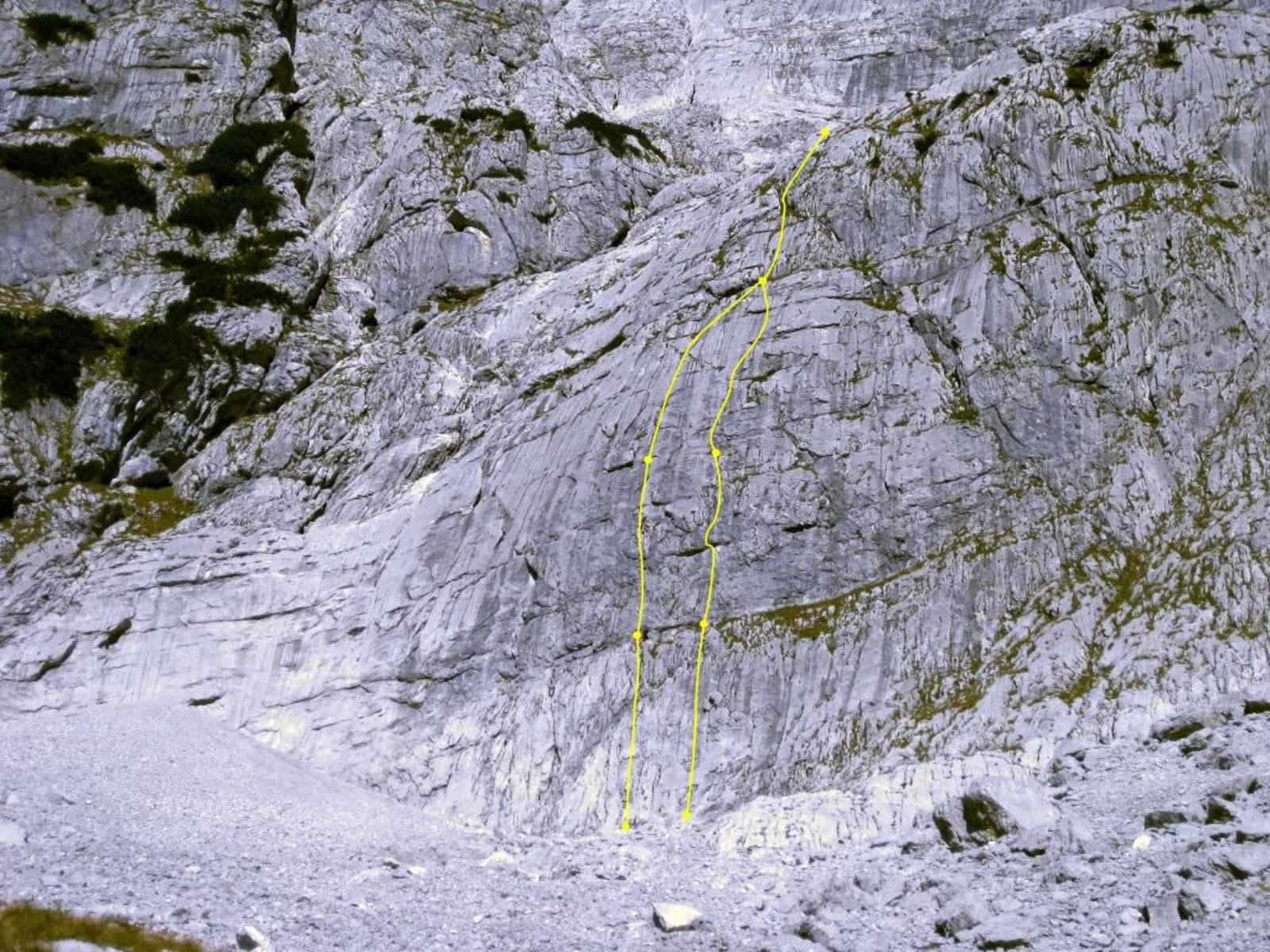 Abseilen über beide Routen mit Doppelseil möglich. Oder orografisch links absteigen zum Wandfuß, Kletterstellen bis 2-.
