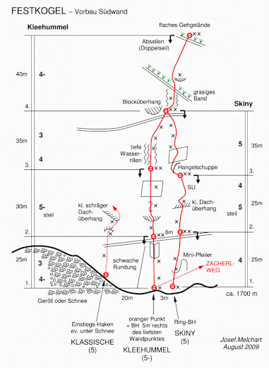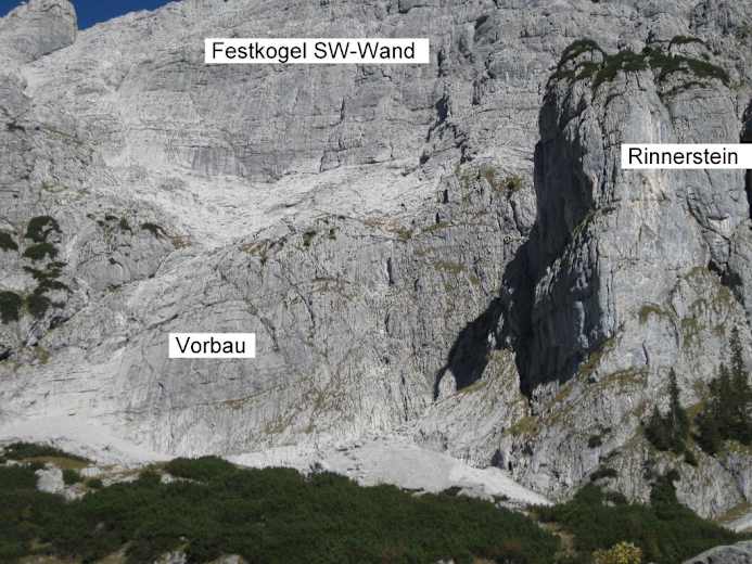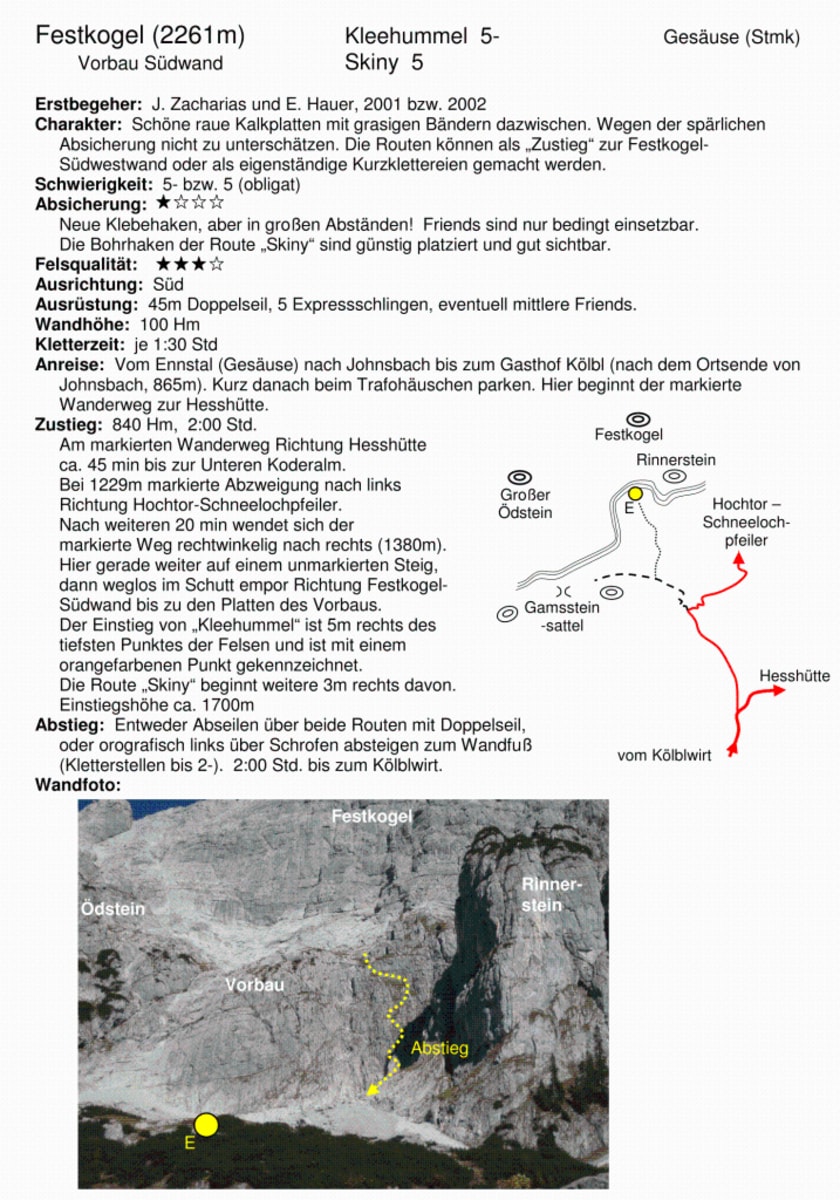 Der Festkogel-Vorbau bietet steile Wände mit für das Gesäuse typischem Fels. Die zwei Kletterrouten „Kleehummel“ und „Skiny“ führen auf die rund 100 m hohe Wand und stellen mit den Schwierigkeitsgraden 5- und 5 auch gute Kletterer vor eine anspruchsvolle Aufgabe. Der Zustieg vom Gasthof Kölbl im Bergsteigerdorf Johnsbach ist recht lang, lohnt sich wegen des guten Felsens aber in jedem Fall.