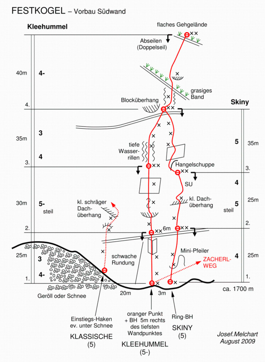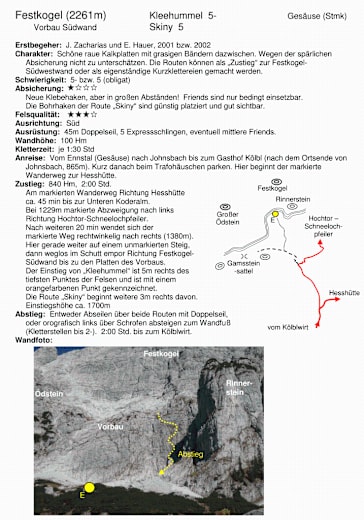 Am markierten Wanderweg Richtung Hesshütte ca. 45 min bis zur Unteren Koderalm. Bei 1.229 m markierte Abzweigung nach links Richtung Hochtor-Schneelochpfeiler. Nach weiteren 20 min wendet sich der markierte Weg rechtwinkelig nach rechts (1.380 m). Hier gerade weiter auf einem unmarkierten Steig, dann weglos im Schutt empor Richtung Festkogel-Südwestwand bis zu den Platten des Vorbaus. Der Einstieg von „Kleehummel“ ist 5 m rechts des tiefsten Punktes der Felsen und ist mit einem orangen Punkt gekennzeichnet. Die Route „Skiny“ beginnt weitere 3m rechts davon. Höhe ca. 1.700 m.
