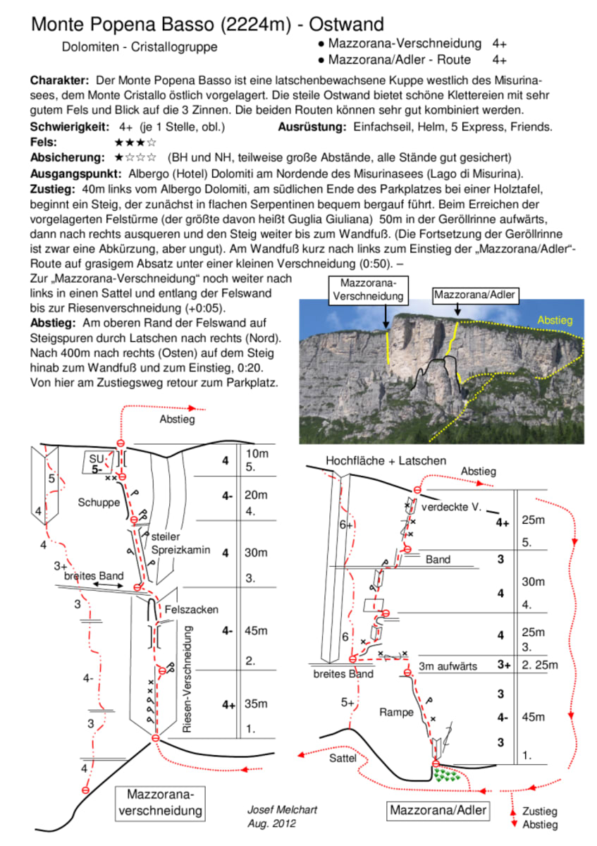 Der Monte Popena Basso befindet sich westlich des Misurinasees in den Italienischen Dolomiten, dem Monte Cristallo östlich vorgelagert. Die steile Ostwand bietet schöne Wand- bzw. Verschneidungsklettereien mit Blick auf den See und die 3 Zinnen. Die zwei beschriebenen Routen („Mazzorana-Verschneidung“ und „Mazzorana/Adler-Route“) sind gleich schwierig und können sehr gut kombiniert werden.