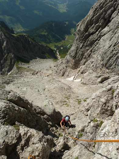 Der Abstieg erfolgt gleich wie der Aufstieg. Es sind ausreichend Abseilstände vorhanden. Die speziell im Abstieg unangenehmen, schotterbedeckten Platten nach der Schlucht können für die unerfahreneren Seilpartner durch Errichtung eines Seilgeländers entschärft werden. --> Brusik. Der letze der Gruppe wird wohl, will er keine Ausrüstung zurück lassen, ohne dieser Sicherungsmaßnahme auskommen müssen. --> Absprache mit anderen Seilschaften, kann hier Zeit und Mühen sparen.