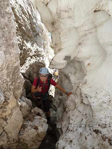 Es folgen 2 Steilstufen im I. und II. Grad, in denen sich die ersten Bohrhaken und Abseilstände befinden. Am Südschluchtausgang liegt ein steiles Schneefeld. Hier kann man eventuell Rucksack, Wanderstöcke oder Eispickel deponieren. Je nach Schneelage muss das Schneefeld überquert werden, oder im Hochsommer unten herum umgangen werden kann. Je nach Lage kann ein mutiger Schritt über die überhängende Schneekluft direkt auf die Felswand von nöten sein, oder die feucht-kühle Umgehung die bessere Entscheidung sein, wobei man sich zwischen dem Eisklotz und der morastigen Felswand durchzwängen muss. Bei der letzteren Variante ist der Aufstieg aufgrund der Nässe und möglicherweise erdiges Schuhwerk schon etwas Mut und Klettertechnik gefragt, um vom Schluchtboden abzuheben (Witterungsabhängig).
