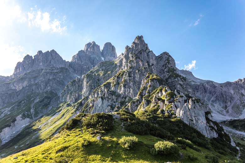 Anspruchsvolle Bergtour auf den höchsten Gipfel des Gosaukammes, der mit seinem gezackten Rücken eine unverwechselbare Kulisse bietet. Trotz der beiden großen Felsstürze hat die Bischofsmütze kaum etwas von ihrer majestätischen Gestalt eingebüßt. Am Gipfelkreuz der Großen Bischofsmütze wird man mit einem 360 Grad-Panorama auf die Gipfelkette der Dachsteiner Alpen in Salzburg belohnt.
