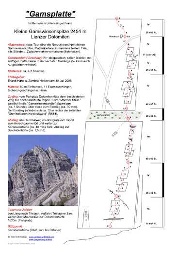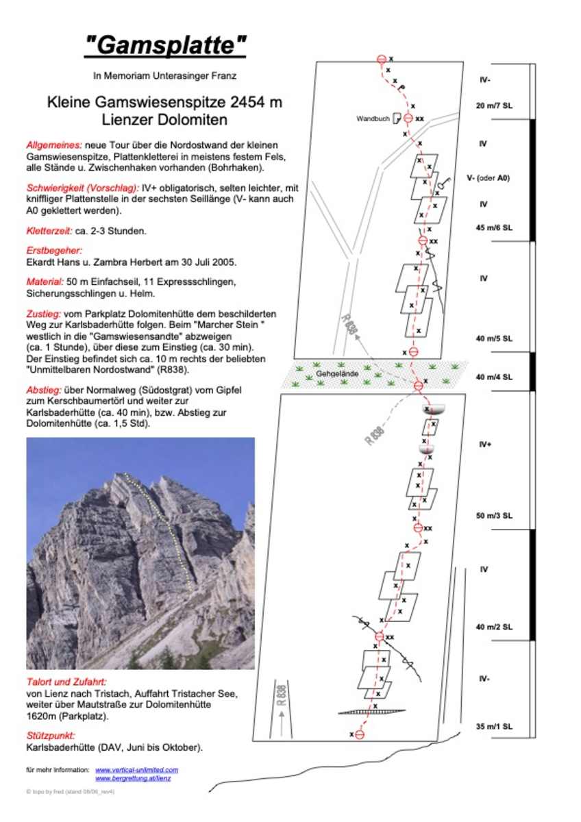 Die „Gamsplatte“ ist eine relativ neue Tour durch die Nordostwand der Kleinen Gamswiesenpitze, 2.454 m, in den Lienzer Dolomiten. Meist darf man sich auf schöne Plattenkletterei in gutem, festem Fels freuen. Alle Stände und Zwischenhaken sind gebohrt.