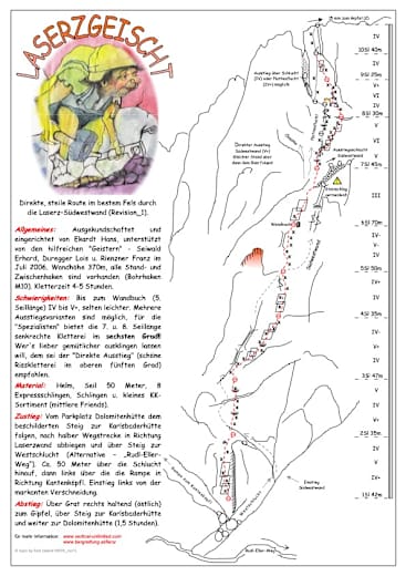 Eine tolle Route mit 10 Seillängen im VI Schwierigkeitsgrad durch bei Laserz Südwestwand in den Lienzer Dolomiten. Ausgangspunkt für diese Tour, wie für viele weitere im Gebiet, ist die Karlsbader Hütte.