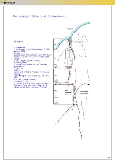 Das Kantenköpf an der Süd- und Südwestwand der Großen Laserzwand in den Lienzer Dolomiten ist für seinen kompakten Felsen bekannt und bei Kletterern sehr beliebt. Zahlreiche Routen führen durch die senkrechten Wänden, die von der Karlsbader Hütte in kurzer Zeit erreichbar sind. Die Cheoma ist eine relativ kurze Route mit 5 Seillängen und einer maximalen Schwierigkeit von VIII.