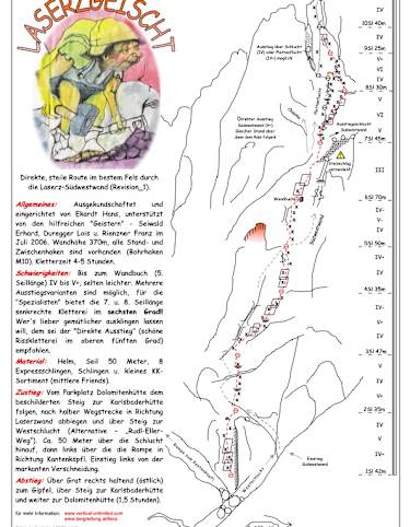 Steile Kletterroute in der Laserz-Südwestwand in den Lienzer Dolomiten, deren Einstieg von der Karlsbader Hütte in kurzer Zeit zu erreichen ist. Die Tour weist 8 Seillängen auf, die schwierigste Stelle ist mit VII bewertet.