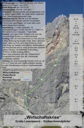 Die Route „Wirtschaftskrise“ ist eine von vielen, die sich durch den festen Felsen der Großen Laserzwand in den Lienzer Dolomiten schlängelt. Der Einstieg ist in kurzer Zeit von der Karlsbader Hütte aus zu erreichen. Die Route weist 10 Seillängen auf, die Schwierigkeiten reichen bis IX-.