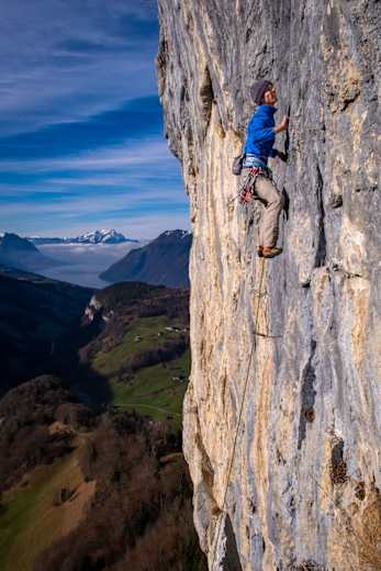 Verdon-Feeling garantiert: wer sich auf die Bänder der Fallenflue begibt, welche die Routen erschliessen, geniesst einen atemberaubenden Tiefblick, der alpines Ambiente aufkommen lässt. Wer hier abheben will, muss technisch versiert und mit genügend Fingerkraft ausgestattet sein. 7 Sektoren mit gesamthaft um die 100 Routen zwischen 6a - 7c warten auf Wiederholer.